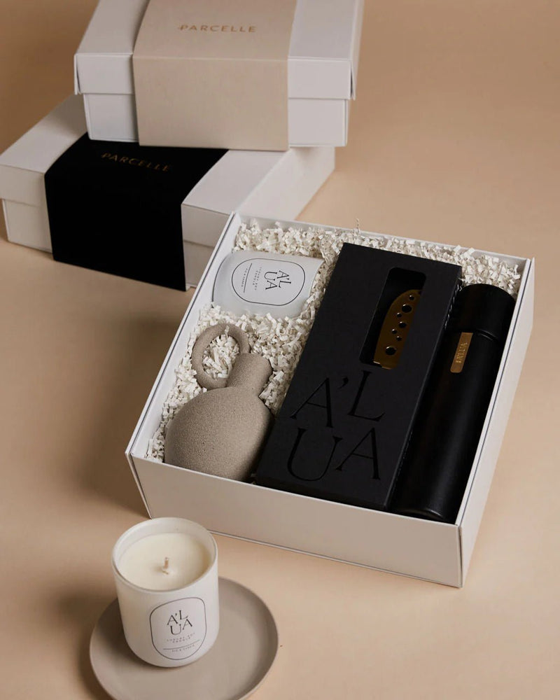 Housed in Parcelle’s Signature Gift Box with your choice of elegant sleeve, this compact yet elevated set features a designer candle, statement tableware, and modern home accents. Optional custom branding makes it ideal for real estate professionals, mortgage brokers, or property developers wanting to impress.